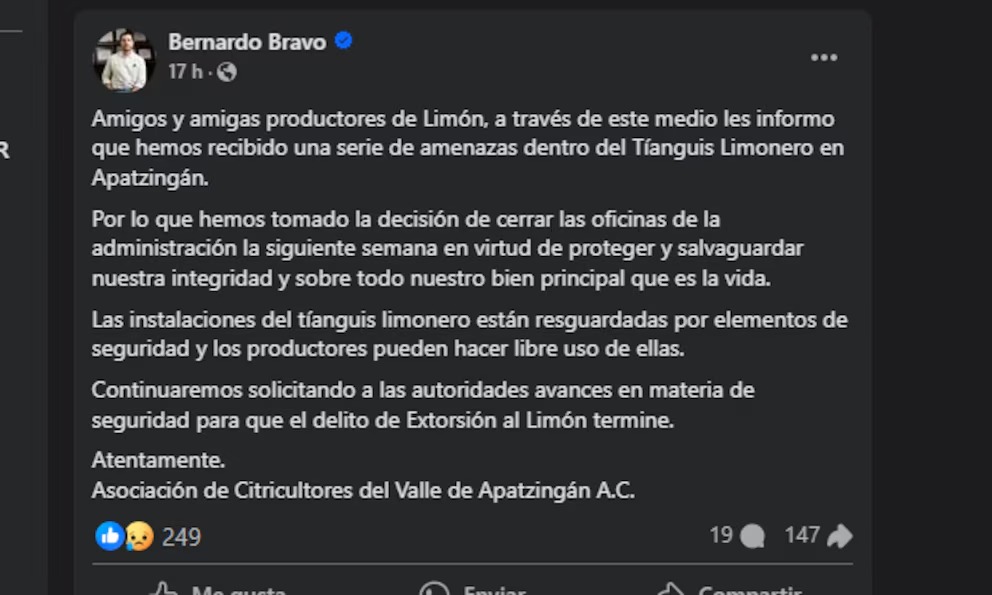 El líder citricultor había reconocido que, a pesar de las diversas acciones implementadas por las autoridades federales y estatales para erradicar el problema de la extorsión, estas no habían surtido efectos tangibles.