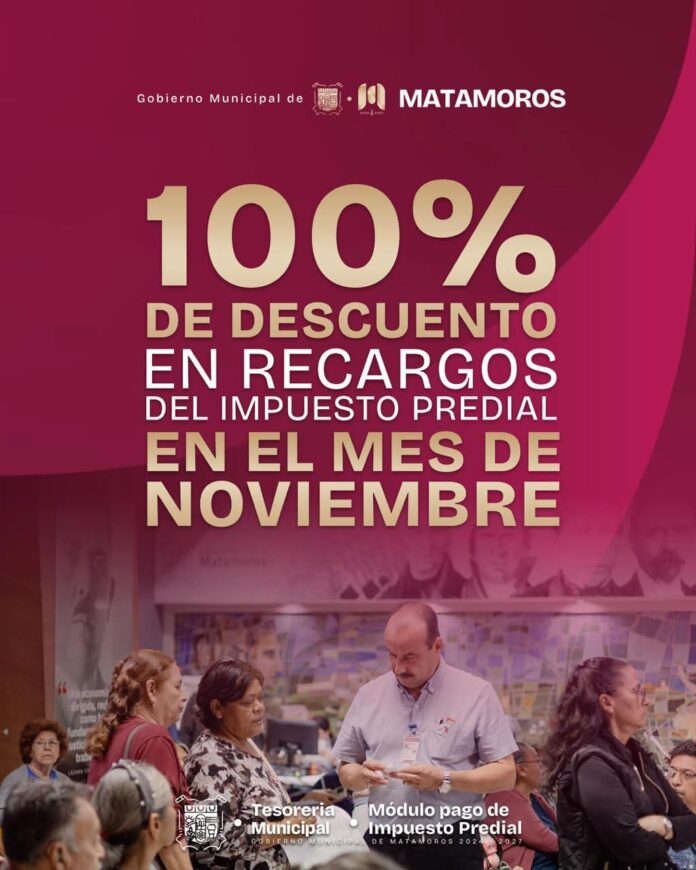 Exhorta gobierno de Matamoros a aprovechar el 100 por ciento de descuento en recargos del predial este Noviembre