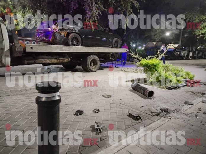 La madrugada de este lunes, la imprudencia al conducir provocó un choque en el pleno centro de la ciudad cuando un vehículo se pasó el alto y termino sobre la plaza principal derribando dos postes y un árbol.