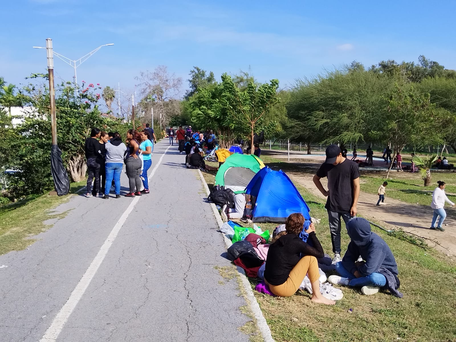 Con casas de campañas, sábanas, cobertores, lonas y bolsas de basura jumbo, los migrantes venezolanos han improvisado un nuevo campamento migrante desde la Avenida Tamaulipas hasta el bordo del río Bravo y en la ciclovía del Parque Lineal del Río.