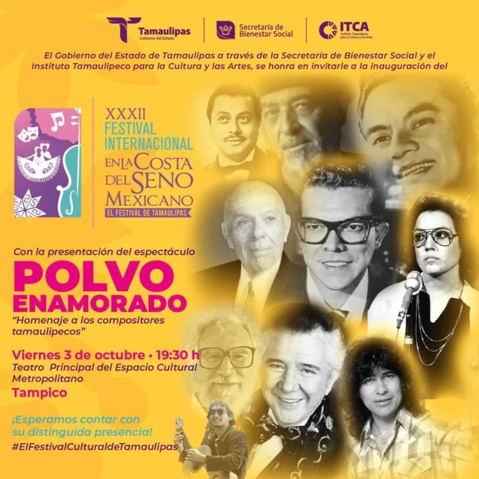 La inauguración oficial a cargo del gobernador Américo Villarreal Anaya tendrá lugar en el Espacio Cultural Metropolitano de Tampico, donde se presentará el espectáculo especial “Polvo enamorado”, una producción original que reúne a destacados artistas tamaulipecos de trayectoria nacional e internacional como Carmen Sarahí, Polo Rojas, Jupiter Bautista, Pepe Navarrete, Héctor Gamaliel, Cynthia Sánchez e Isabelle Govea. Este concierto rendirá homenaje a compositoras y compositores que han marcado la historia musical del estado, entre ellos Cuco Sánchez, Roberto Cantoral, Rigo Tovar, Lolita de la Colina, Rockdrigo González y Juan García Esquivel.